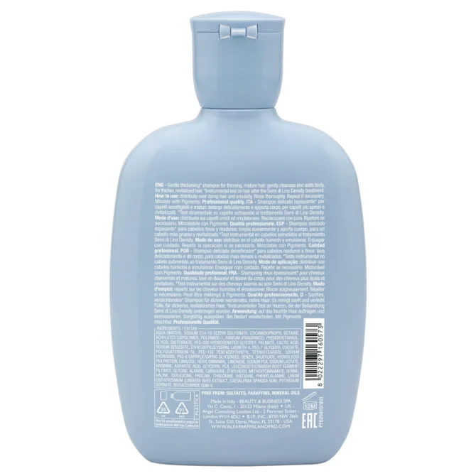 Alfaparf Milano Semi di Lino Density Thickening Low Shampoo 250ml este un șampon profesional densificator, creat special pentru părul subțire, fragil sau afectat de procesul natural de îmbătrânire. Formula sa delicată, fără sulfați, curăță eficient scalpul și fibra capilară, oferind în același timp volum și o senzație de păr mai des și mai plin de viață.