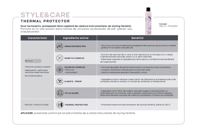 Pulverizați uniform pe tot părul înainte de a utiliza instrumente de styling electrice. Nu se clătește.