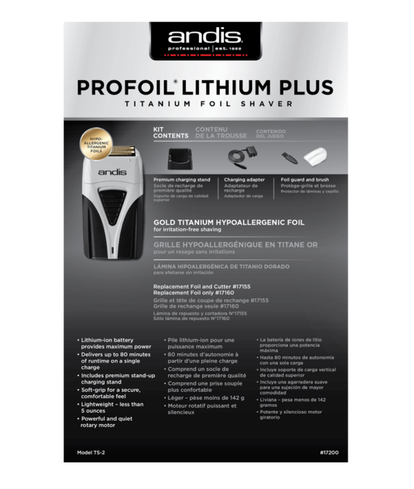 Comenzi telefonice: 0736 116 601Acest aparat de ras Andis TS-2 este varianta imbunatatita a celui anterior TS-1. Prima diferenta este baza de incarcare premium si practica. A doua diferenta este materialul cauciucat folosit pe lateral pentru o aderenta mai buna.
