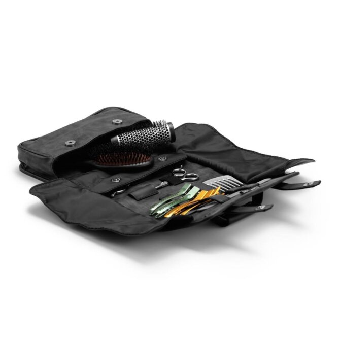 Exista spatiu special delimitat pentru 3 foarfece si 3 piepteni precum si un compartiment unde poate fi depozitata masina de tuns sau contur, perii etc.