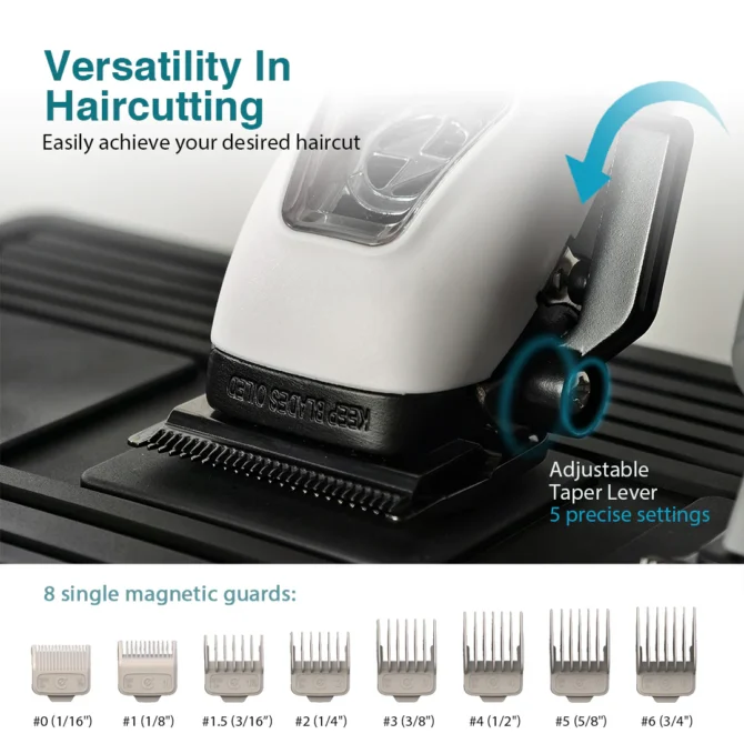 Design robust cu bază metalică şi capac superior anti-fade din poliamidă pentru reducerea zgomotului şi vibraţiilor. Include 8 piepteni magnetici (#0-#6), cablu USB-C şi capac de rezervă, pentru o experienţă completă. Funcţionează exclusiv wireless — perfectă pentru saloane şi freelanceri care cer echipament fiabil.