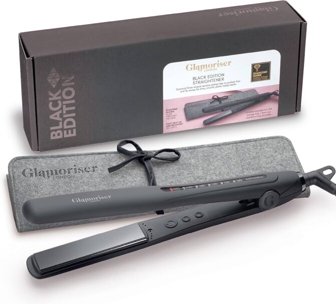 Placa de păr Glamoriser 235 °C Salon Straightener este concepută pentru a asigura un rezultat profesionist, direct acasă. Plăcile ceramice infuzate cu ulei de diamant (Black Diamond Oil) alunecă ușor prin păr, reducând fricțiunea şi minimalizând deteriorarea firului de păr. Un sistem de încălzire rapidă permite atingerea temperaturii de 235°C, ideală pentru păr gros sau rebel, iar tehnologia avansată asigură distribuirea uniformă a căldurii. Alte caracteristici remarcabile includ mai multe trepte de reglaj al temperaturii, cablu lung cu rotație (swivel) pentru libertate în manevrare, și posibilitatea de utilizare internațională (dual voltage) – aspect apreciat dacă călătorești. Întrebuințarea este simplă: selectezi temperatura adecvată în funcţie de tipul de păr, treci placa prin secţiuni mici, lăsând să alunece în mod constant – rezultatul: păr drept, strălucitor, cu volum controlat. Construcția robustă și designul elegant, de culoare neagră, îl fac un accesoriu de styling favorit pentru cei care urmăresc un look lucios şi stilizat rapid. Potrivit pentru toate tipurile de păr, însă recomandat mai ales pentru cele mai greu de gestionat sau cu textură grosă, care necesită căldură mai mare pentru stilizare eficientă. Mențiune: utilizarea la temperaturi mari presupune aplicarea prealabilă a unui produs de protecție termică, pentru a menține sănătatea firului de păr.