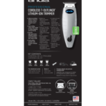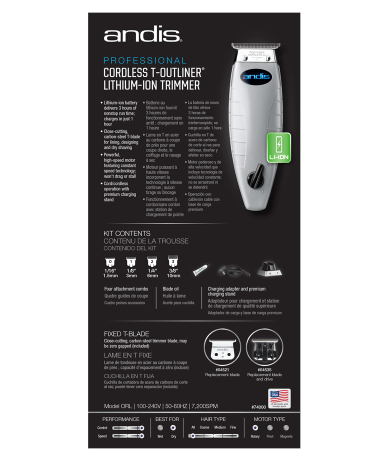 Comenzi telefonice: 0736 116 601ANDIS T-outliner cordless este o masina profesionala pentru contur fara cablu ce ofera o tehnologie inovativa si performata pentru o taiere de neegalat. Poate fi folosita atat in saloanele de infrumusetare cat si pentru uz personal. Aceasta are un motor foarte puternic, rotativ, ce dezvolta 7200 rotatii pe minut. Bateria este de tip litiu-ion iar combinata cu motorul rotativ puternic taie orice tip de par – atat parul umed cat si pe cel uscat. Autonomia bateriei ajunge pana la 100 de minute de utilizare continua iar timpul de incarcare completa este de doar 60 de minute.