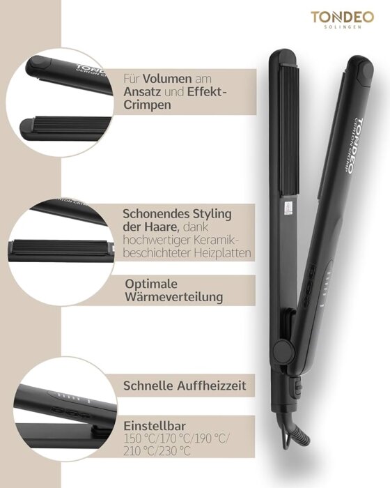 Transformă-ți coafura cu Tondeo Cerion Crimp, placa de creponat ideală pentru a adăuga volum, textură și un stil distinct părului tău. Creată de brandul german de renume Tondeo, această placă îmbină tehnologia avansată cu un design ergonomic pentru rezultate profesionale – fie că ești hairstylist sau îți dorești un look spectaculos acasă.
