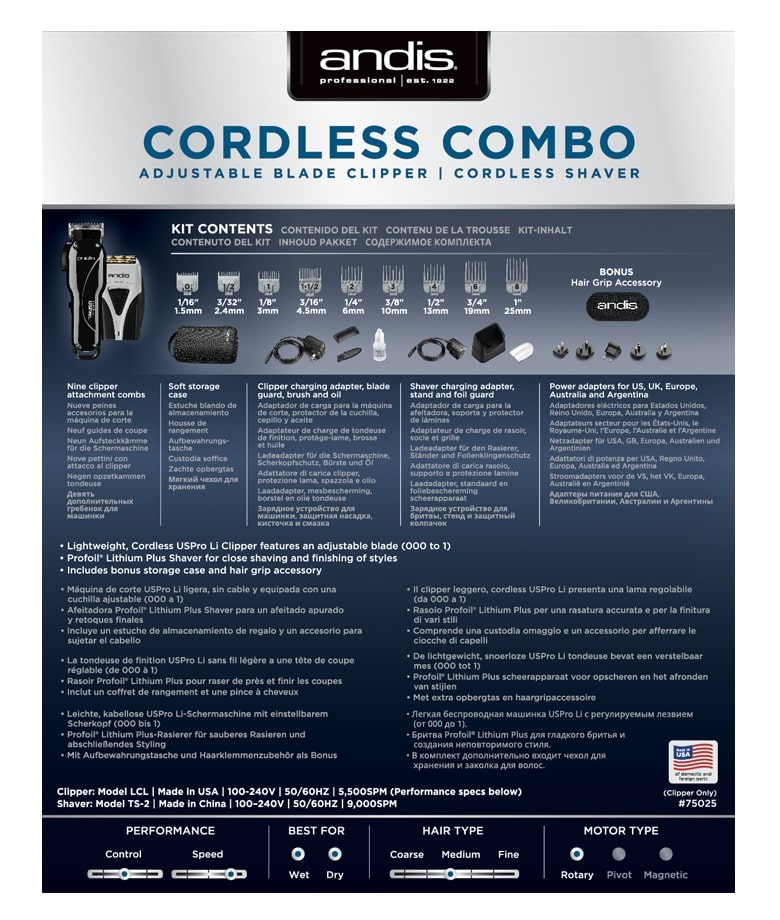 Andis USPRO LI este o masina de tuns profesionala cu un motor puternic ce taie cu o viteza de 5500 de rotatii pe minut. Asadar este o masina potrivita pentru toate tipurile de par. Aceasta vine cu acumulator si cablu ce pune la dispozitie o tehnologie inovativa si performanta de taiere.